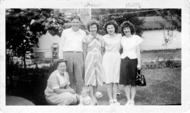 Arlene (Papp)(24), Joe(24), and Deb (baby) Kish, Irene Pocsik(19), Liz Kish(19), and Betty Pocsik (22), taken during Irene and Betty's visit to "Aunt Susan's" (Zsuzsana (Duzs) Kish) in Flint, MI, 1947. Irene and Betty's mom and Joe and Liz's mom Maria (Duzs) Pocsik are sisters.